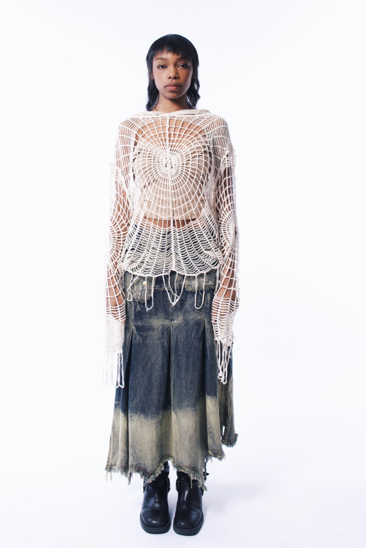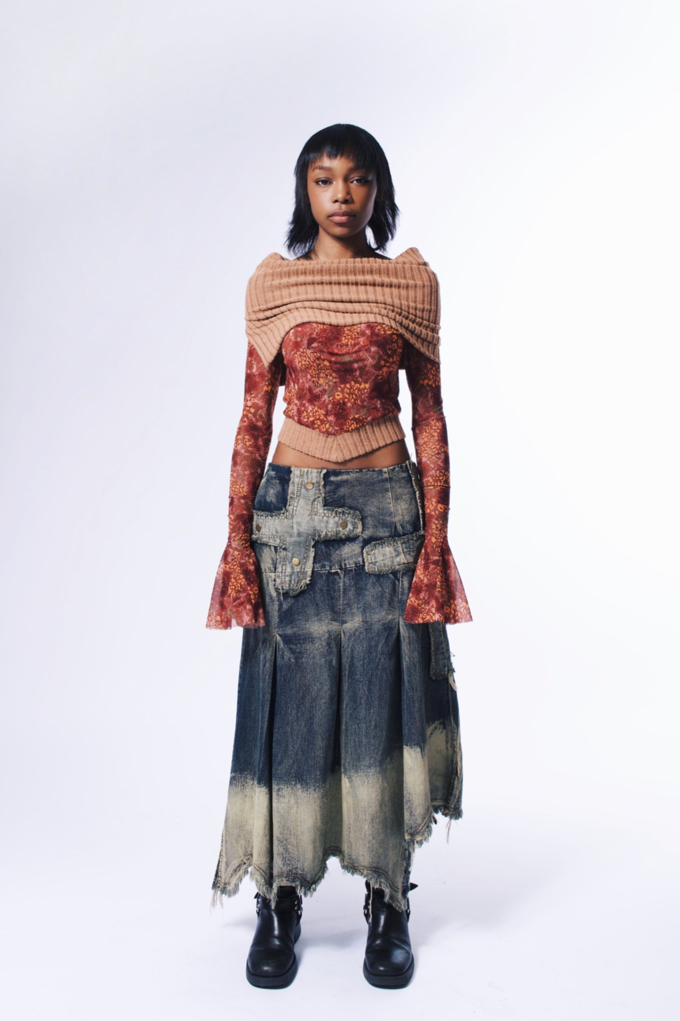 Punk denim Lolitas found in every corner of the streets; this season’s denim collection introduces a long skirt style. The design focuses on an irregular slit silhouette, showcasing a character that is effortlessly casual, laid-back, and infused with a punk wasteland aesthetic. The irregular hem, with its washed brown vintage feel, uses a casual frayed technique to break away from the stiffness of traditional denim styles. The biggest advantage lies in seamlessly blending the characteristics of denim with the brand's distinctive style, creating a unique denim ensemble for the young girls. The incorporation of cross elements in the decoration, along with the final touch of studs, adds a distinctive flair. Practicality is also addressed with adjustable features for comfort and fabric durability against stains, presenting a versatile design that can be worn as a half skirt or a strapless dress. This collection embodies an incredibly creative and cool denim Lolita image for young girls to express their individuality
