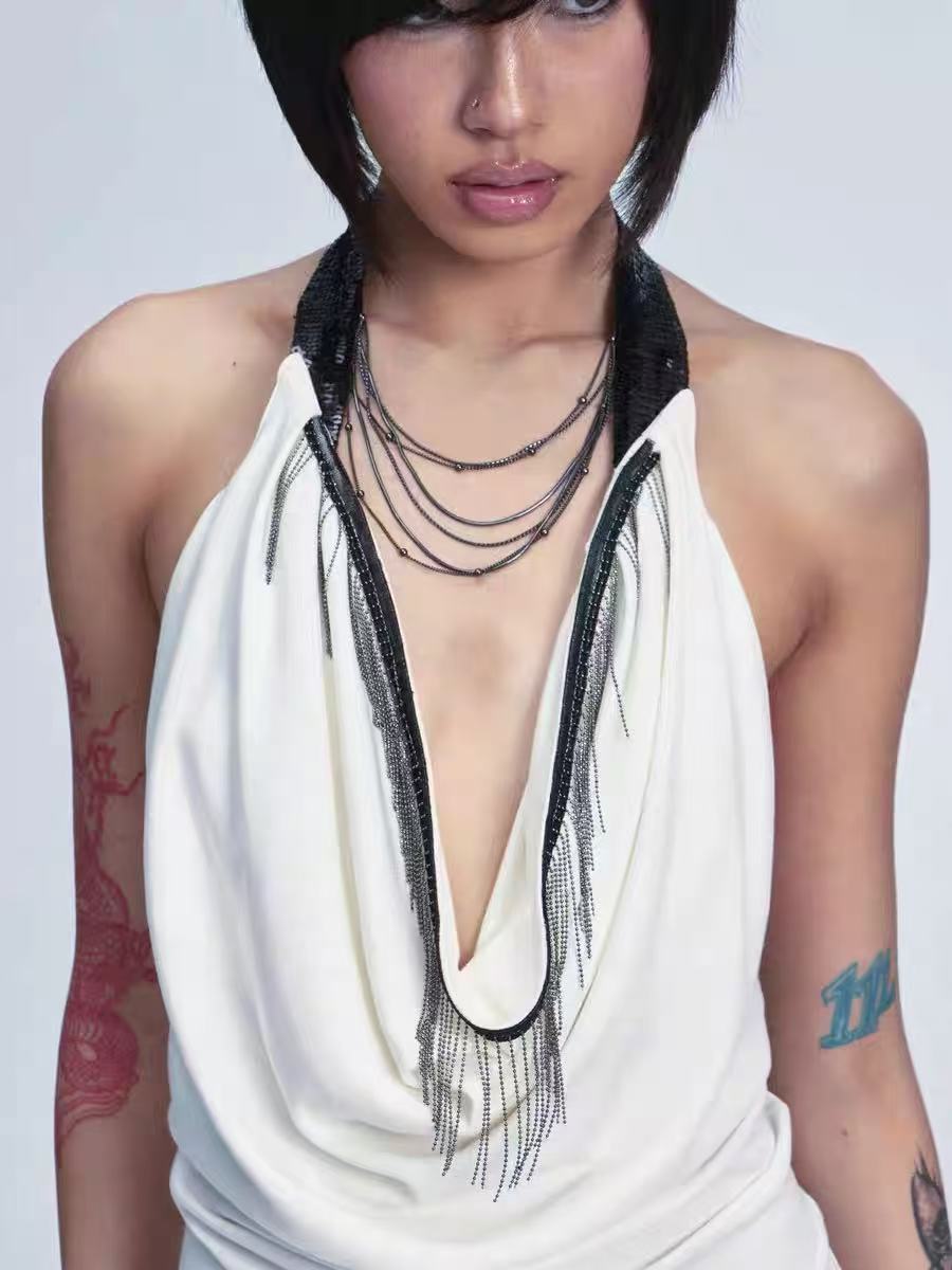 • Gunmetal chain detail at chest