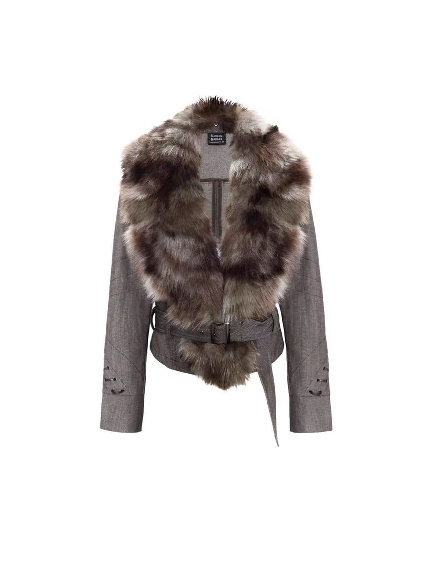 • Features a detachable, fluffy fur collar in a mixed brown, white, and black colorway
