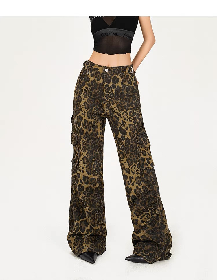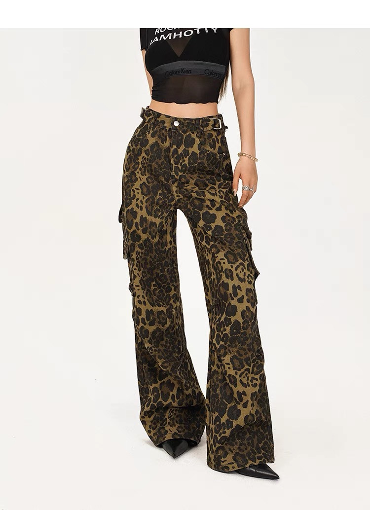 Step up your street style game with these American high-street leopard print cargo pants. Crafted for both comfort and trendiness, these wide-leg relaxed fit trousers exude effortless chic. With their loose, straight-cut design, they offer a relaxed silhouette that's perfect for everyday wear. Pair them with a fitted top and sneakers for a casual yet fashionable look that's sure to turn heads wherever you go.