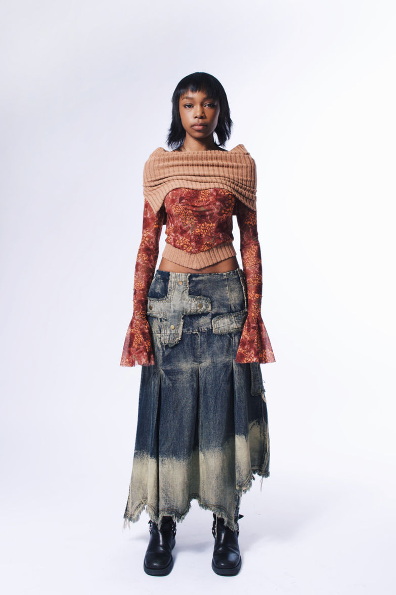 Punk denim Lolitas found in every corner of the streets; this season’s denim collection introduces a long skirt style. The design focuses on an irregular slit silhouette, showcasing a character that is effortlessly casual, laid-back, and infused with a punk wasteland aesthetic. The irregular hem, with its washed brown vintage feel, uses a casual frayed technique to break away from the stiffness of traditional denim styles. The biggest advantage lies in seamlessly blending the characteristics of denim with the brand's distinctive style, creating a unique denim ensemble for the young girls. The incorporation of cross elements in the decoration, along with the final touch of studs, adds a distinctive flair. Practicality is also addressed with adjustable features for comfort and fabric durability against stains, presenting a versatile design that can be worn as a half skirt or a strapless dress. This collection embodies an incredibly creative and cool denim Lolita image for young girls to express their individuality