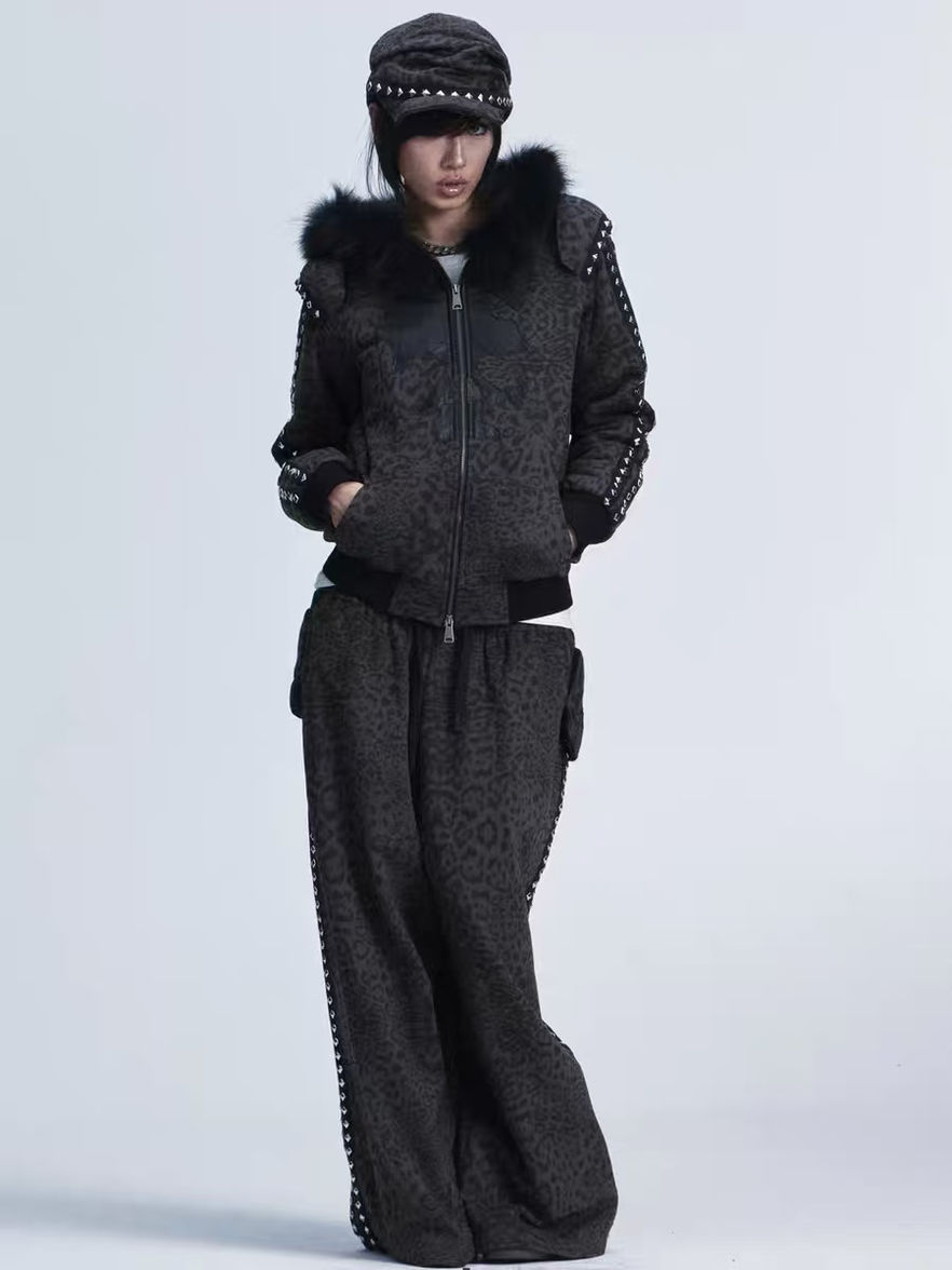 • Bold leopard print with oversized faux fur collar and detachable leopard-print hat