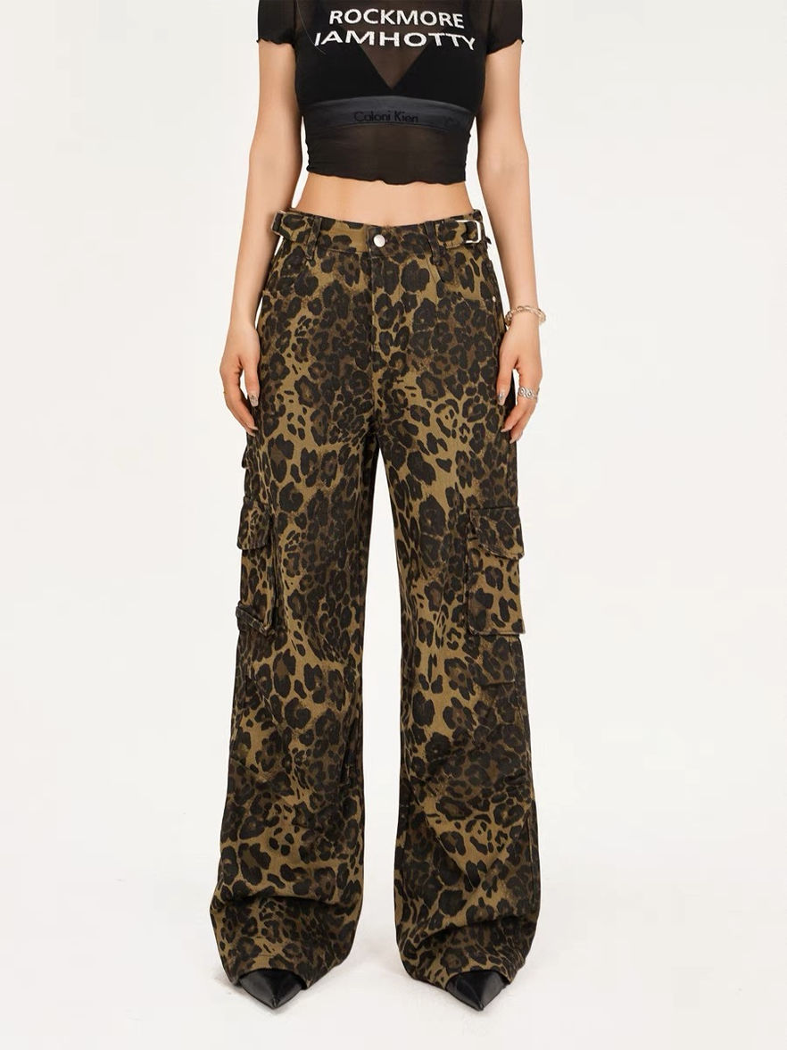 Step up your street style game with these American high-street leopard print cargo pants. Crafted for both comfort and trendiness, these wide-leg relaxed fit trousers exude effortless chic. With their loose, straight-cut design, they offer a relaxed silhouette that's perfect for everyday wear. Pair them with a fitted top and sneakers for a casual yet fashionable look that's sure to turn heads wherever you go.